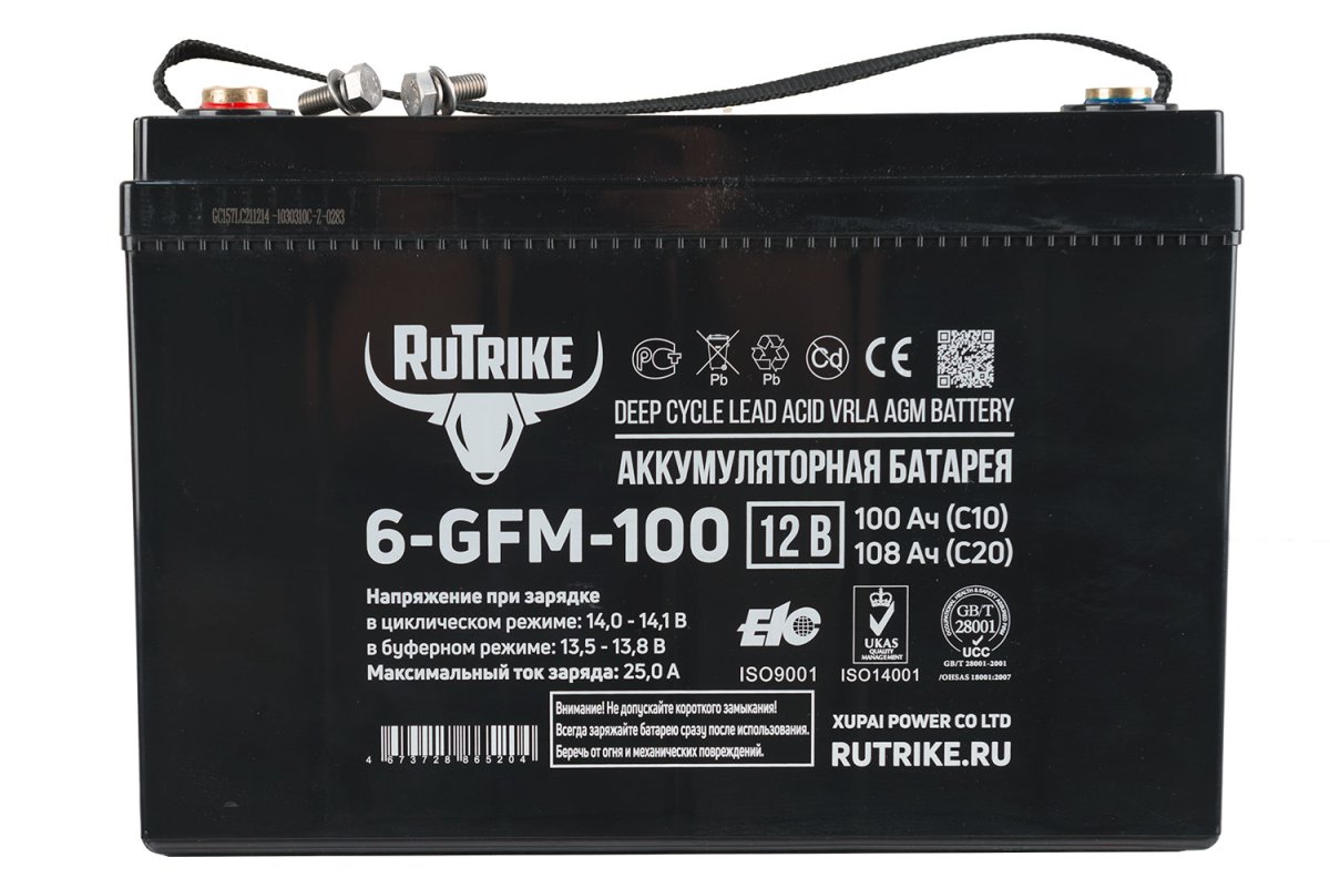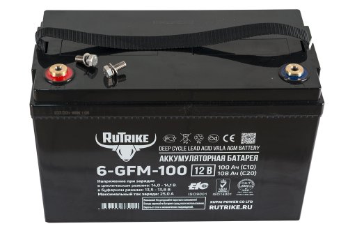 Зарядка должна осуществляться оригинальным зарядным устройством Rutrike, или проверенным, соответствующим характеристикам устройством заводского изготовления в соответствии с инструкцией к этому зарядному устройству и требованиями к напряжению и силе тока. Зарядное устройство должно быть импульсным, полностью автоматическим, с функцией десульфатации пластин, специально предназначенное для AGM аккумуляторных батарей.