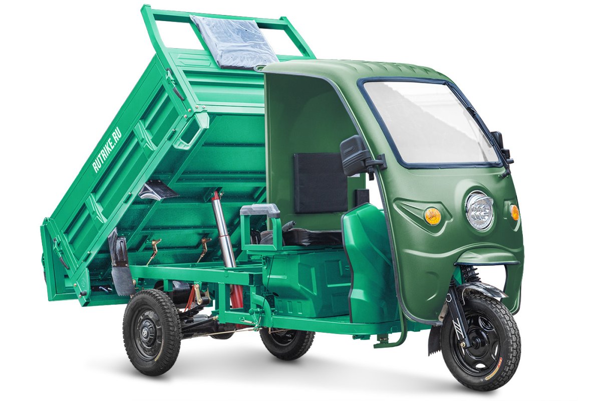 Электрический трицикл Rutrike D5 Кабина гидравлика оснащён крепким и вместительным кузовом с высокими бортами и гидравлическим подъёмным механизмом, позволяющим быстро осуществлять погрузку-разгрузку. Мощный гидравлический подъёмный привод позволяет поднимать кузов с загрузкой до 400 кг. А общая грузоподъёмность трицикла составляет до 900 кг.