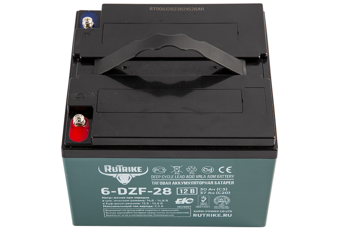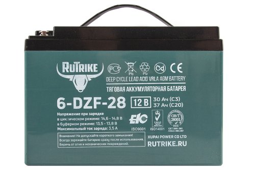 Необслуживаемая аккумуляторная батарея Rutrike 6-DZF-28 с системой рекомбинации газов (VRLA) произведена по технологии AGM. Батарея выполнена по технологии внутреннего формования. В толстых свинцовых пластинах используется экологичный сплав без кадмия и мышьяка.