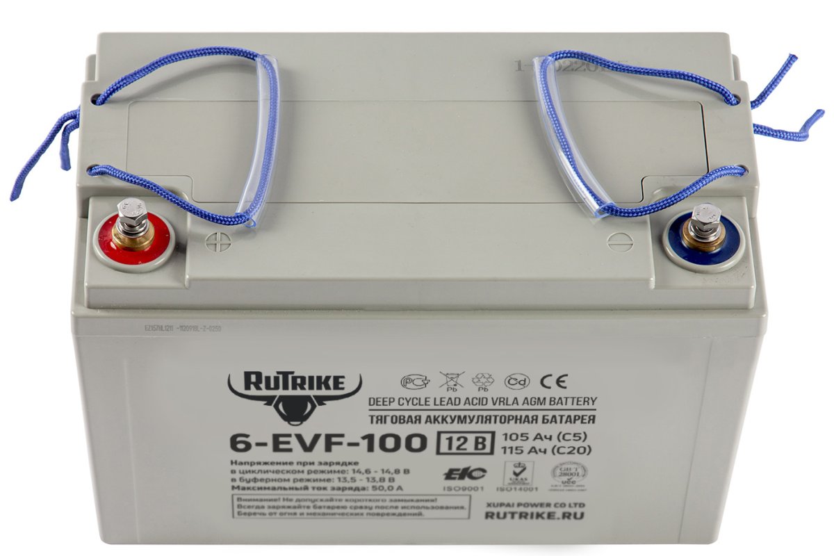 Тяговая аккумуляторная батарея Rutrike 6-EVF-100 поддерживает функцию быстрой зарядки с высокой силой тока до 50 Ампер, однако постоянно прибегать к быстрой зарядке мы не рекомендуем, поскольку количество рабочих циклов при постоянной зарядке с высокой силой тока снижается.