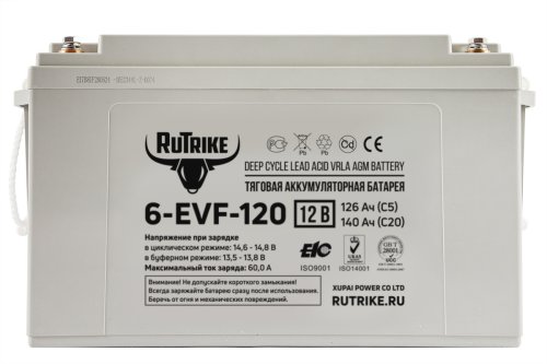 Rutrike 6-EVF-120 — необслуживаемая аккумуляторная батарея с системой рекомбинации газов (VRLA) произведённая по технологии AGM. Батареи выполнены по технологии внутреннего формования. В свинцовых пластинах, имеющих большую толщину по сравнению со стандартными аккумуляторами, используется экологичный запатентованный сплав без кадмия и мышьяка. Плотный сепаратор из углеволокна пропитан электролитом, изготовленным по технологии NANO GEL. Электролит находится в сгущенном состоянии, не даёт утечек и не требует долива воды на протяжении всего срока эксплуатации.