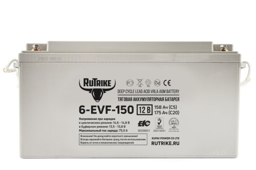 Rutrike 6-EVF-150 - необслуживаемая аккумуляторная батарея с системой рекомбинации газов (VRLA) произведенная по технологии AGM. Батареи выполнены по технологии внутреннего формования. В свинцовых пластинах, имеющих большую толщину по сравнению со стандартными аккумуляторами, используется экологичный запатентованный сплав без кадмия и мышьяка. Плотный сепаратор из углеволокна пропитан электролитом, изготовленным по технологии NANO GEL. Электролит находится в сгущенном состоянии, не даёт утечек и не требует долива воды на протяжении всего срока эксплуатации.