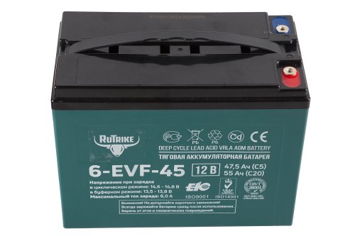 Rutrike 6-EVF-45 - необслуживаемая аккумуляторная батарея с системой рекомбинации газов (VRLA) произведенная по технологии AGM. Батареи выполнены по технологии внутреннего формования. В свинцовых пластинах, имеющих большую толщину по сравнению со стандартными аккумуляторами, используется экологичный запатентованный сплав без кадмия и мышьяка. Плотный сепаратор из углеволокна пропитан электролитом, изготовленным по технологии NANO GEL. Электролит находится в сгущенном состоянии, не даёт утечек и не требует долива воды на протяжении всего срока эксплуатации.