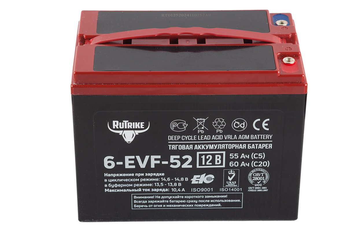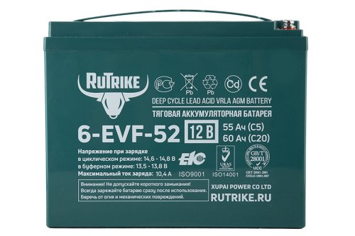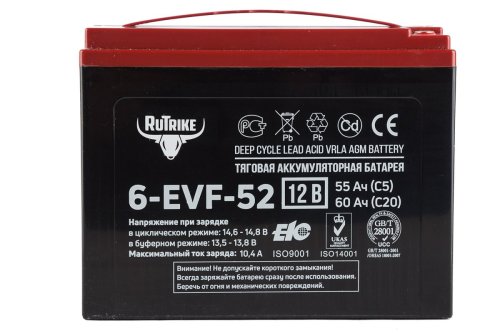 Rutrike 6-EVF-52 - необслуживаемая аккумуляторная батарея с системой рекомбинации газов (VRLA) произведенная по технологии AGM. Батареи выполнены по технологии внутреннего формования. В свинцовых пластинах, имеющих большую толщину по сравнению со стандартными аккумуляторами, используется экологичный запатентованный сплав без кадмия и мышьяка. Плотный сепаратор из углеволокна пропитан электролитом, изготовленным по технологии NANO GEL. Электролит находится в сгущенном состоянии, не даёт утечек и не требует долива воды на протяжении всего срока эксплуатации.